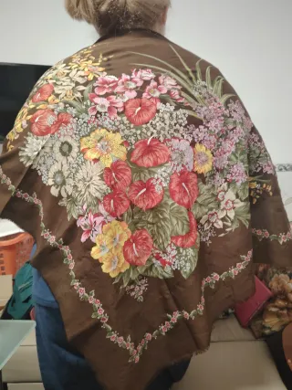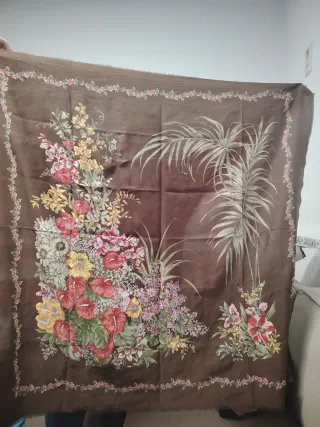 Pañuelo con un diseño floral vibrante sobre un fondo marrón. - Borde decorado con pequeñas flores. - Estampado detallado de flores y hojas. - Motivo de palmeras en una esquina.