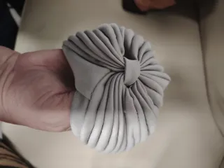Gorro de tela gris con un diseño plisado y un detalle anudado en la parte frontal. - Diseño plisado. - Detalle anudado. - Tejido suave.