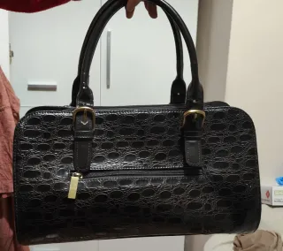 Elegante bolso de mano con textura de piel de cocodrilo. Es marrón aunque en las fotos parece negro - Diseño alargado y estructurado. - Asas superiores. - Detalle de hebillas doradas.