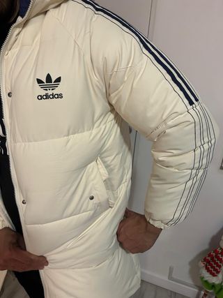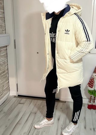 Chaqueta acolchada de la marca Adidas, ideal para el frío. Su diseño moderno la hace perfecta para cualquier ocasión. - Color blanco roto. - Cierre de botones a presión. - Capucha. - Tres rayas características en las mangas.