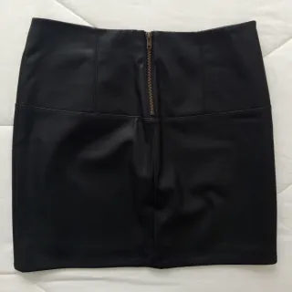 Falda corta de efecto piel, con un diseño moderno y versátil. - Material: Efecto piel. - Color: Negro. Cintura alta Largo falda 44 cm Talla 38-40 Poco uso