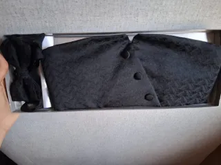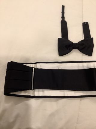 Conjunto de fajín y pajarita para esmoquin. - Fajín con pliegues. - Pajarita con ajuste. - Color negro. - En su estuche original. - Sin marca. - Medida parte frontal 11 cm..