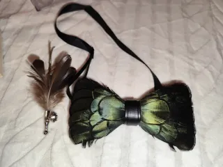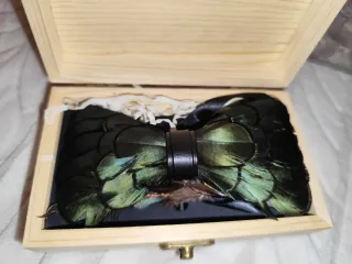 Elegante pajarita confeccionada con plumas naturales. Hecho a mano - Diseño único con plumas en tonos negros y verdes. - Presentada en una caja de madera. - Cierre central de cuero.