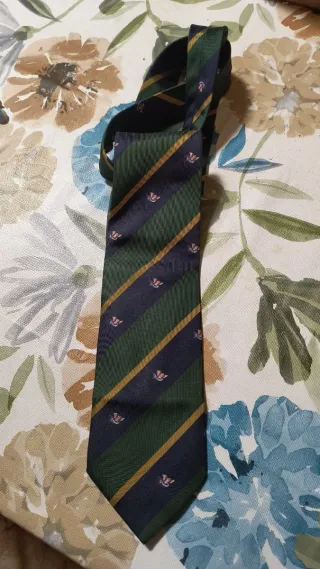 Elegante corbata de la marca Paul & Shark con un diseño de rayas en tonos verdes y azul marino. Presenta un patrón de pequeños pajaritos en color coral y detalles en amarillo dorado. - Diseño de rayas diagonales. - Pajaritos bordados a lo largo de la corbata. - Combinación de colores verde, azul marino y amarillo.