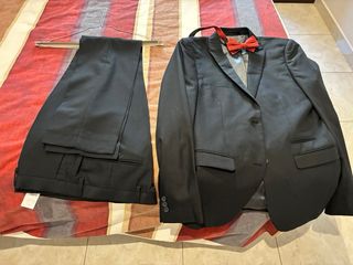 Elegante traje de Eassy Wear en color negro, perfecto para eventos formales. Incluye una llamativa pajarita roja. - Chaqueta de traje. - Pantalón de traje. - Pajarita roja.