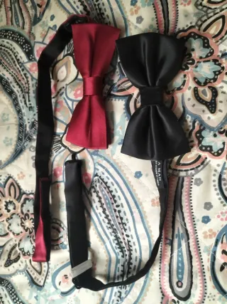 Pajaritas con diferentes diseños. - Pajarita azul con puntos blancos. - Pajarita azul con corazones rojos. - Pajarita azul con patrón de rombos. - Pajarita verde con acabado satinado. Todas se encuentran limpias y en perfecto estado para usar. Pregunta sin compromiso !!!