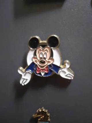 Pin antiguo de Mickey Mouse con un elegante traje azul y pajarita roja. - Diseño detallado de Mickey Mouse. - Acabado metálico dorado y esmaltado.