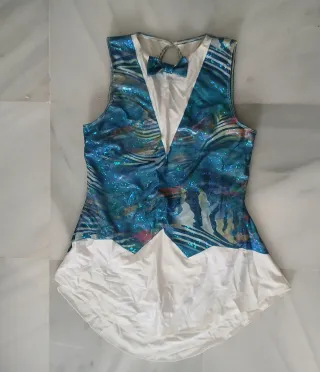 Maillot de patinaje artístico con un diseño llamativo. Solo tiene un uso. - Parte superior con estampado brillante en tonos azules. - Detalle de pajarita. - Parte inferior blanca.