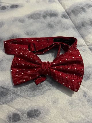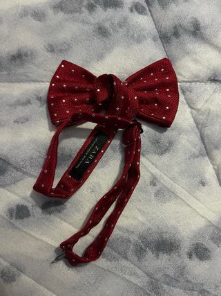 Pajarita de la marca ZARA, color rojo burdeos con pequeños lunares blancos. - Diseño elegante y clásico, ideal para eventos, bodas, cenas o looks formales. - Incluye cinta ajustable para el cuello. - Como nueva, usada 1 sola vez. - Material de buena calidad, ligera y cómoda.