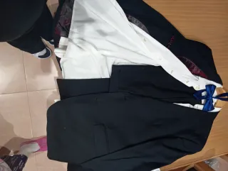 Conjunto de traje y camisa para hombre. Utilizado una única vez. Marca Easy Wear, perteneniciente al Corte Inglés. La chaqueta es una 46, si es tu talla la camisa debería quedarte bien, el pantalón una 42, la Pajarita es ajustable. - Traje de color azul. - Camisa de color blanco. - Pajarita morada de regalo para el traje.