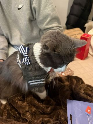 Precioso jersey tejido para gato, con un diseño elegante y un detalle de pajarita. - Tejido de punto gris con detalles de rayas blancas. - Pajarita azul y blanca a juego.
