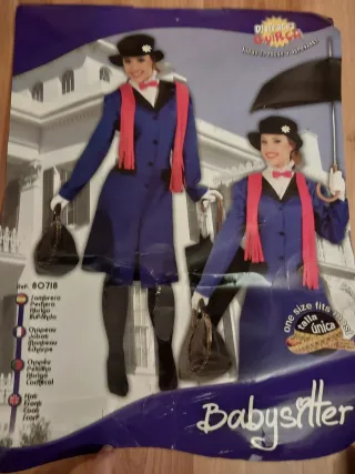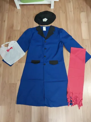 Disfraz de Mary Poppins. - Incluye abrigo azul, sombrero negro con flor, pañuelo rojo y cuello blanco con pajarita. También tengo el paraguas por 20€
