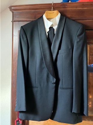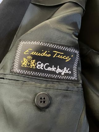 Esmoquin de hombre, negro, elegante y clásico. - Pura lana virgen. - Color negro. - Marca Emidio Tucci, El Corte Ingles. - Talla 54. - Chaqueta solapa smoking. Sin apertura y con un solo boton. - Pantalon conjunto chaqueta smoking con cenefa lareral, negro, talla. Talla 44. - incluye camisa blanca cuello smoking doble puño para gemelos y botones escamoteados bajo jareta. Marca Mercanti Veneti. Talla 40 (15 3/4). - Incluye pajarita idónea para camisa smoking, azul oscuro. Casi nuevo a estrenar. Es mío. Yo mido 1,76 y peso 80 Kg.