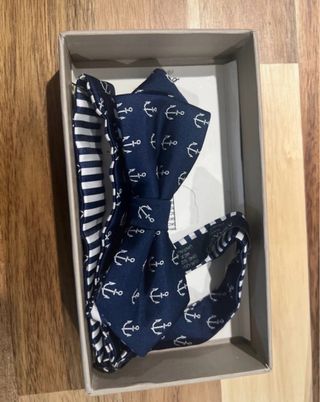 Elegante pajarita con diseño marinero. - Estampado de anclas blancas sobre fondo azul marino. - Reverso con rayas blancas y azul marino.