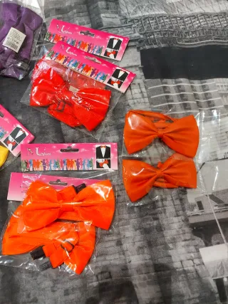 Lote de pajaritas de tela, ideales para disfraces o fiesta temática . Vienen en varios colores, hay 2 de cada color (blanco, rosa, amarillo, azul pirufo, morado, verde, rojo, naranja, teja) En foto 2, se diferencia un par color rojo, otro par naranja fosforito y otro par naranja/teja. - Pajaritas de efecto satinado. - Diseño clásico de lazo. - Ajustables para un uso cómodo. Todas por 10€. Sueltas a 1€