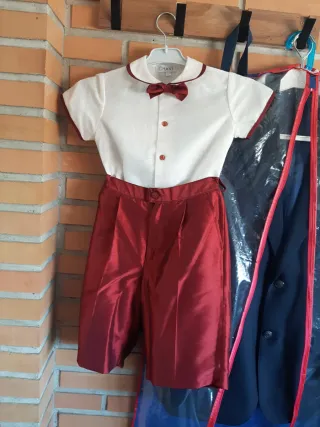 Conjunto de dos piezas para pajes o eventos especiales. - Camisa blanca con cuello y mangas ribeteadas en rojo. - Pantalón corto rojo con pinzas y cinturilla. - Incluye pajarita a juego.
