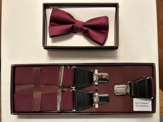 Elegante conjunto de pajarita y tirantes en color burdeos de la marca Núñez de Arenas. - Pajarita con diseño de lunares. - Tirantes ajustables con clips metálicos. - Composición: 85% Poliéster, 15% Elastano.