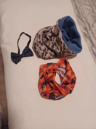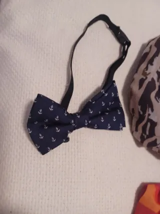 Conjunto de accesorios para niño. - Pajarita azul con estampado de anclas. - Braga de cuello con estampado de camuflaje y forro azul. - Braga de cuello con estampado geométrico naranja y negro.