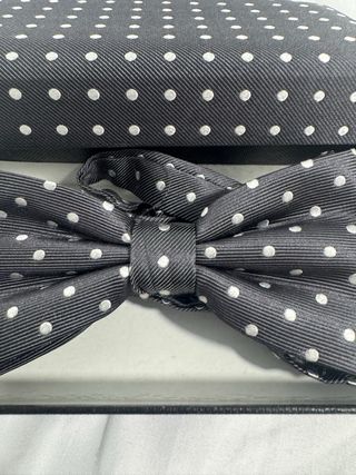 Elegante pajarita de smoking con un diseño clásico de puntos blancos sobre fondo negro. Viene presentada en su caja original. - Diseño de lunares blancos. - Incluye caja de presentación.