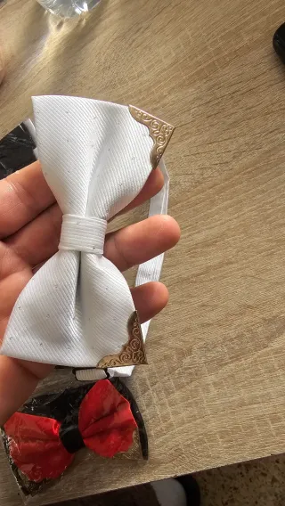 Pajarita de vestir con un diseño sofisticado y detalles que la hacen única. 4 colores disponibles Blanco y negro y rojo y azul - Acabado en color blanco con pequeños detalles brillantes. - Adornos metálicos dorados en las puntas.