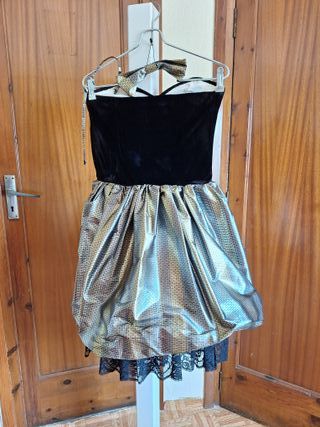Vestido de fiesta con un diseño elegante y llamativo. - Cuerpo superior de terciopelo negro. - Falda plateada con brillo. - Detalle de encaje negro en el bajo. - Incluye pajarita a juego.