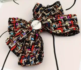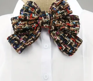 Medidas: 16x18 cm. Elegante lazo/pajarita/ broche. De Tweed Multicolor. Añade un toque de sofisticación y color a cualquier outfit con esta llamativa pajarita . Confeccionada en tejido de tweed negro con textura bouclé, presenta hilos entretejidos multicolores vibrantes (incluyendo tonos azules, rojos, violetas, verdes, marrones y dorados) que capturan la luz y la atención. Este accesorio versátil funciona perfectamente como un broche elegante para el cuello de una camisa blanca, o un adorno para un vestido. ¡Deja volar a tu imaginación! ⚡