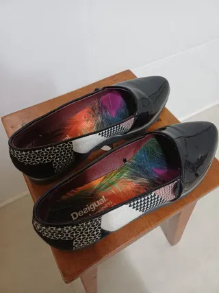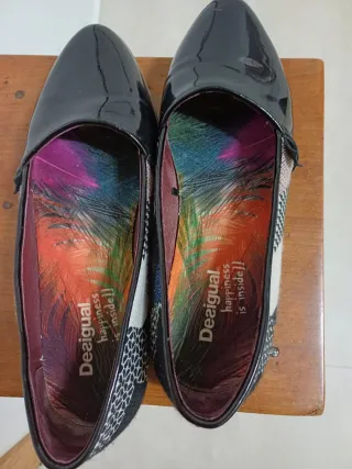 Zapatos planos Desigual con un diseño llamativo.La talla es más bien la 39, aunque marca 40. - Exterior brillante en color negro. - Interior con estampado de plumas multicolor. - Detalle de logo Desigual happiness is inside!! en la plantilla.