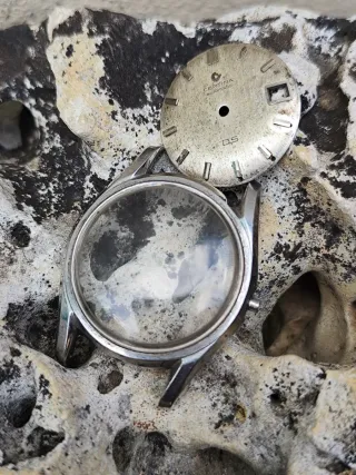 Conjunto de chasis y esfera para reloj Certina DS Automatic vintage. 👉 LO QUE SE VE EN LAS IMÁGENES,LA ESFERA TIENE LAS PATAS CORTADAS.VER FOTOS Y (TENED ESTO MUY CLARO). -34 mm. -Acero. -Cristal plexi. -Marcas típicas del uso y del paso de los años. - Esfera de color beige con marcadores de hora. - Chasis de reloj con cristal. 👁️👁️ Fijaros bien en las imágenes son una parte muy importante de la descripción.