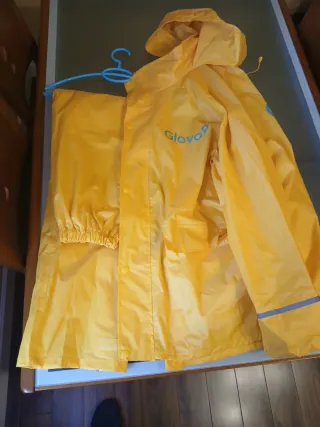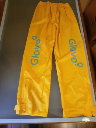 Conjunto de chubasquero y pantalón de la marca Glovo. - Chubasquero con capucha. - Pantalón con cintura elástica. - Detalles reflectantes en las mangas.