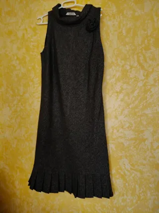 Elegante vestido de invierno sin mangas, ideal para ocasiones especiales o para el día a día. - Diseño con cuello alto. - Detalle floral en el cuello. - Falda con plisado. - Tejido texturizado.
