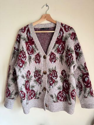 Cárdigan de punto con estampado floral. - Diseño de rosas en tonos rojos y verdes. - Cuello en V y cierre de botones. - Tejido suave y confortable.