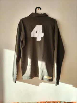 Jersey Lois - Estilo Urbano 🐂 Diseño: Suéter de cuello redondo en color verde militar con un tejido de punto con textura de "grano de arroz". Detalles Frontales: Parche circular estilo retro en el pecho con el texto "Lois Jeans - Genuine Article". Pequeña placa metálica con el logo de Lois en el borde inferior derecho. Detalles en la Espalda: Cremallera decorativa (o funcional de ajuste) en el hombro izquierdo. Logo de la marca y el mítico toro de Lois bordados en blanco en la parte superior central. Composición y Talla: Hecho de 60% acrílico y 40% algodón. Talla 12 (ideal para niños/adolescentes). Diseñado en España.