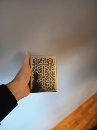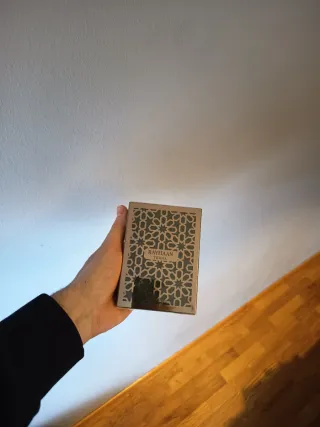 Este es el perfume Rayhaan Terra. - Envase con diseño geométrico. - Tonos dorados y marrones.