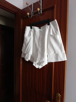 Pantalones cortos blancos con un diseño de volantes. - Cintura con botón y cremallera. - Bolsillos delanteros. - Diseño de doble capa en el bajo.