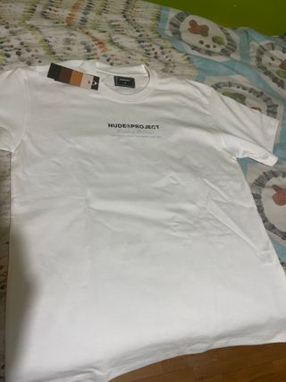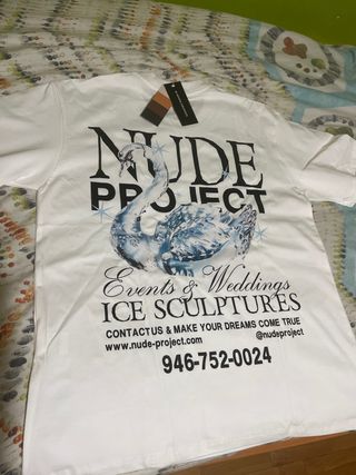 Camiseta blanca de Nude Project con diseño de cisne y texto. - Diseño frontal con cisne y estrellas. - Texto: Events & Weddings ICE SCULPTURES. Se pueden escuchar ofertas
