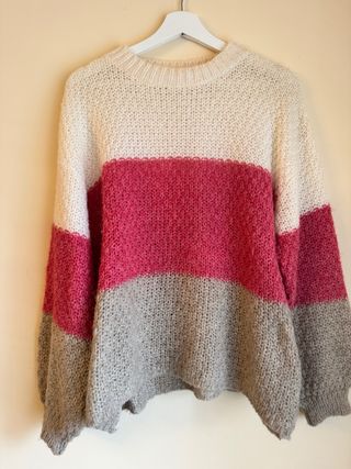 Jersey punto (lana) Hoss. Tres franjas en color rosa apagado, crema y beige oscuro. Talla M. Manga estilo farol. Muy buen estado.