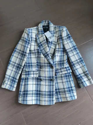 Americana de Zara con un diseño de cuadros en tonos azules y blancos. Es una prenda elegante y versátil. - Cierre cruzado con botones. - Bolsillos delanteros. - Cuello solapa.