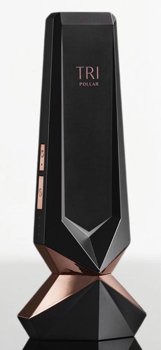 Dispositivo de radiofrecuencia facial TRIPOLLAR Skinvity. - Diseño elegante en color negro y oro. - Forma facetada y moderna.