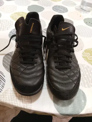Botas de fútbol Nike Tiempo para césped artificial. Muy poco uso. - Color negro. - Cierre con cordones. - Logo de Nike en dorado. - Detalle Tiempo en la lengüeta.