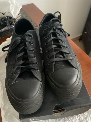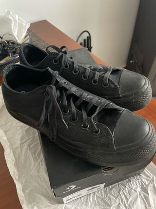 Zapatillas Converse en color negro. Había desgaste en el interior del talon que ha sido arreglado por un zapatero, y no se han vuelto a utilizar desde el arreglo. Han sido utilizadas con insertos así que el interior está en bueno estado. Ya no las puedo llevar al ser demasiado planas. En su caja original. No envío por Boyaca.