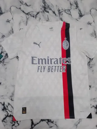 Camiseta de fútbol del AC Milan. - Diseño blanco con detalles en rojo y negro. - Logo de Puma bordado. - Escudo del AC Milan. - Sponsor Emirates Fly Better.