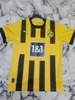 Camiseta de fútbol del Borussia Dortmund. - Diseño a rayas verticales. - Logo de Puma y escudo del BVB 09. - Patrocinador 1&1.