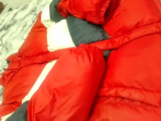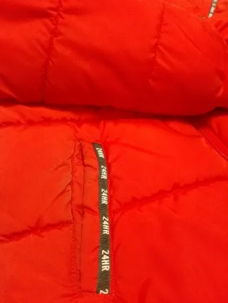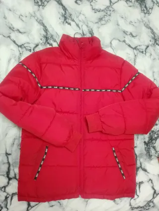 Abrigo acolchado de color rojo con detalles distintivos. - Diseño moderno y llamativo. - Ribetes decorativos en mangas y bolsillos. - Cuello alto para mayor protección.