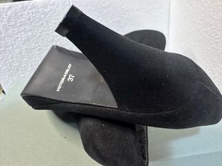 Elegantes tacones negros de la marca Victoria Delef. - Diseño clásico y sofisticado. - Material exterior de ante. - Tacón de altura media. Solo con leves marcas en la plantilla de adentro , pero No esta Dañadas!!.