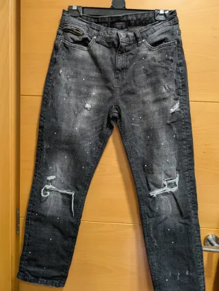 Tejano de la marca Suply con un diseño moderno y desgastado. - Lavado efecto piedra. - Detalles de rotos y salpicaduras blancas. - Cremallera frontal y bolsillos. - Estilo urbano y actual. Talla niño 13-15 años XL