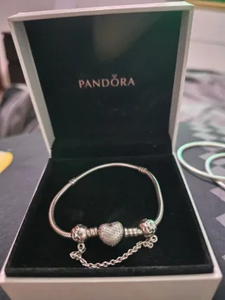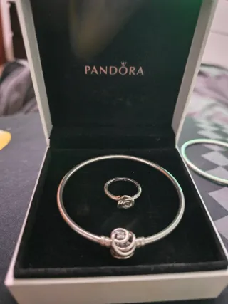 Conjunto Pandora. Original sin embalaje -Pulsera(medidas en la imagen ) -Cadena de seguridad - 2 charms ( paleta y 18) - Anillo ( talla 10) * La pulsera y todo el conjunto presentan signos de uso , no arañazos profundos , pero si leves y no falta ninguna piedra a ninguno de los productos y hay capturas de precio original en tienda . * El precio es por conjunto (negociable) y si se quiere algo especifico tambien se puede negociar *Si necesitan mas fotos por favor escriban sin compromiso :) *** SOLO RECOGIDA EN MANO ***