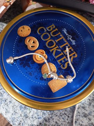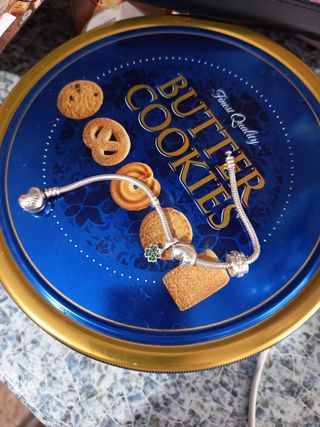 Pulsera de la marca Pandora con varios charms. - Charm en forma de corazón. - Charm con forma de trébol de cuatro hojas. - Charm con forma de galleta. - Charm con pequeñas circonitas rosas.