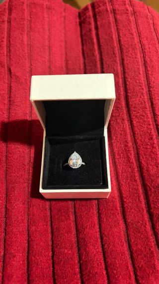 Elegante anillo de promesa de la marca Pandora. Su diseño combina la plata con detalles brillantes. - Diseño de pera con circonitas. - Banda adornada con pequeñas circonitas.