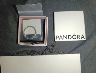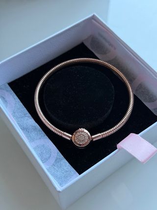 Pulsera rígida de la marca Pandora, con un tamaño de 17 cm.33€. Con 3 charm 66 €. Charm individual 15€. - Diseño elegante y atemporal. - Cierre seguro y funcional. Pulsera incluye la caja blanca de Pandora. Comprado en el stand de Pandora en el corte inglés.