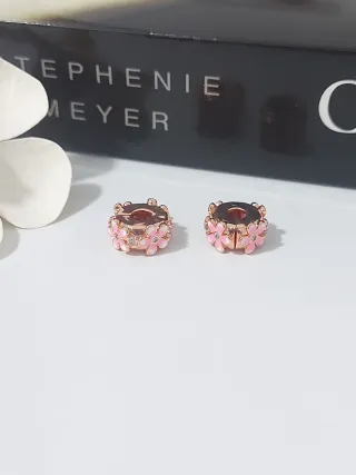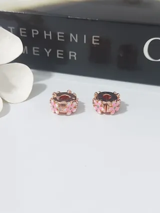 Dos charms para pulsera Pandora con un delicado diseño de flores. - Acabado en tono oro rosa. - Detalle de flores esmaltadas en rosa. - Pequeños cristales blancos incrustados.